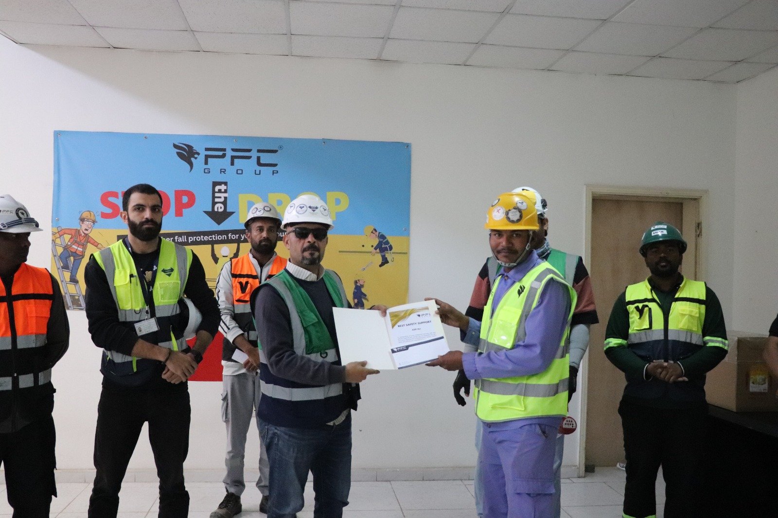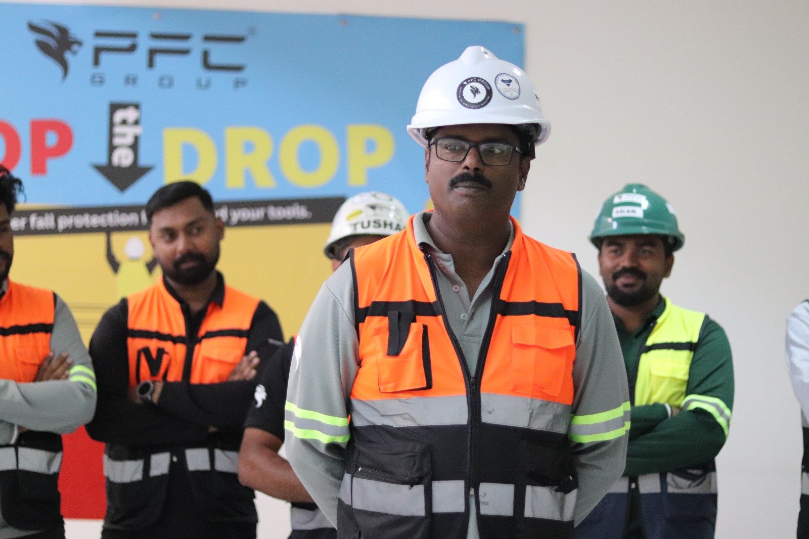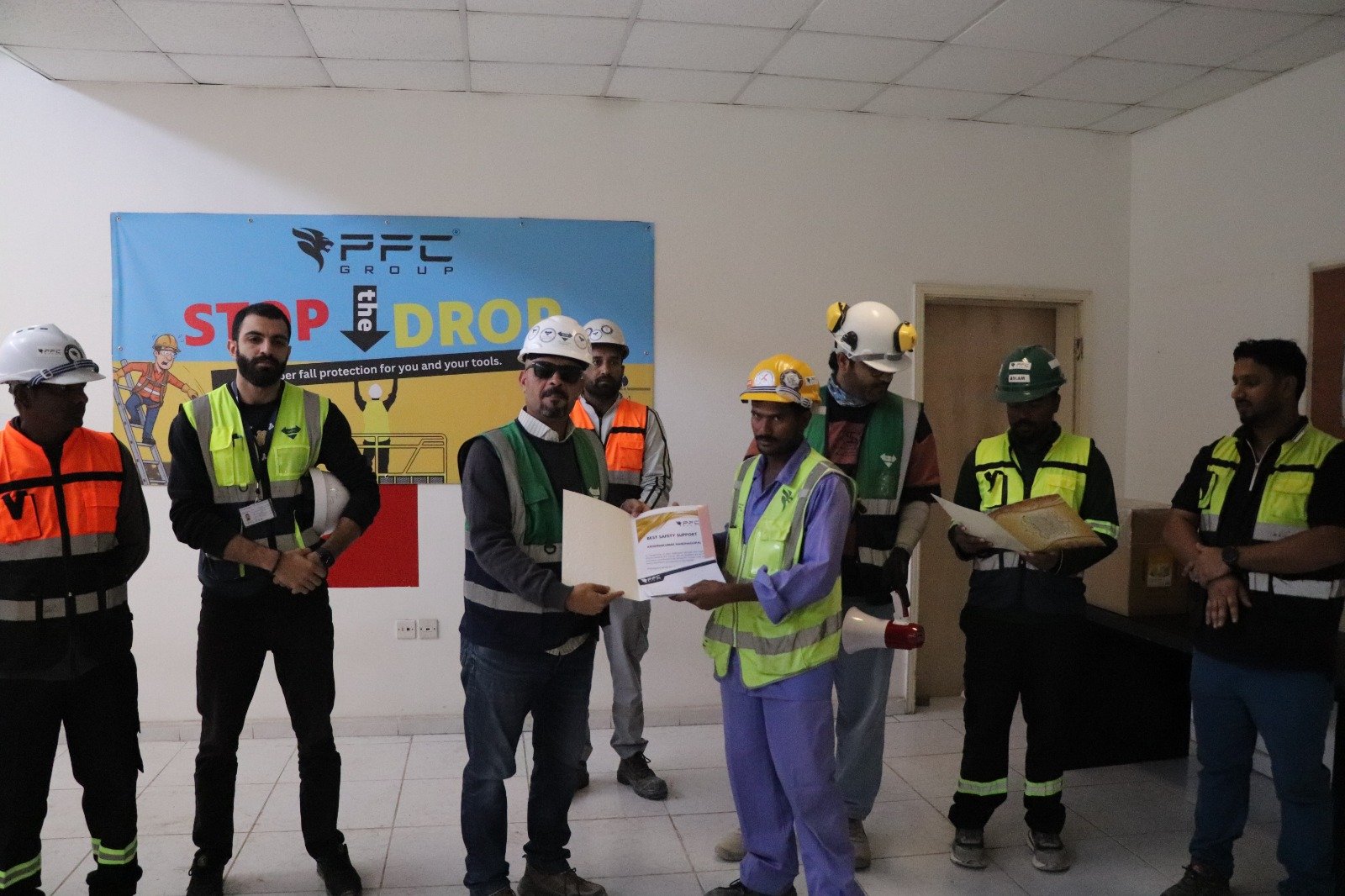The Stop the Drop HSE Campaign was a comprehensive three-day initiative designed to mitigate dropped-object hazards and enhance workplace safety. The program commenced with a focused Toolbox Talk that defined hazards—such as falling tools and debris—and identified high-risk activities like scaffolding work and lifting operations. Over the course of the campaign, leadership, including PFC HSE Manager Liyon Jose and BCG HSE Manager Ahmed Kamal, facilitated detailed awareness speeches, visual campaign displays, and practical demonstrations of preventive controls like tool lanyards, toe boards, and proper material stacking. The event also featured interactive elements, such as a quiz session with BCG HSE Engineer Fayaz Khan and the presentation of Best Safety Awards to recognize exemplary worker participation. Ultimately, this structured engagement improved workforce compliance and reinforced individual responsibility for maintaining a secure overhead environment.